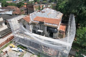 Após a limpeza geral do local, as equipes concluíram a restauração das telhas e a reconstrução de toda a estrutura do telhado, que passa agora pela fase de recomposição. Também foi finalizada toda a etapa de emboço das paredes.
