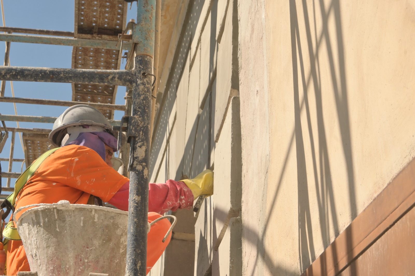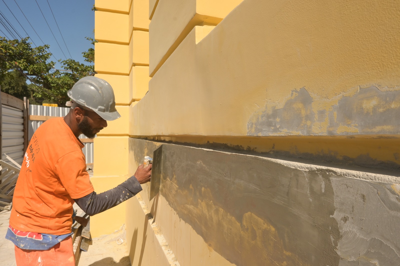 A fachada principal passa por processo de restauração, com serviços de pintura e recuperação avançando gradualmente.