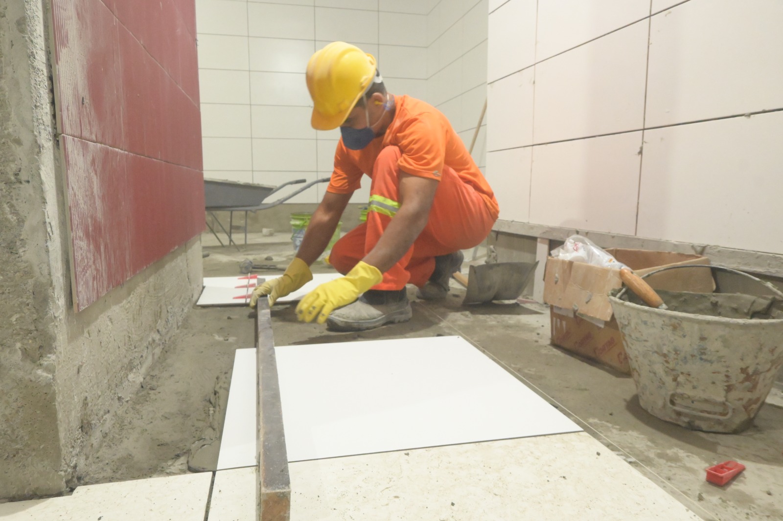 Os banheiros e camarins recebem acabamento e aguardam a instalação das louças.