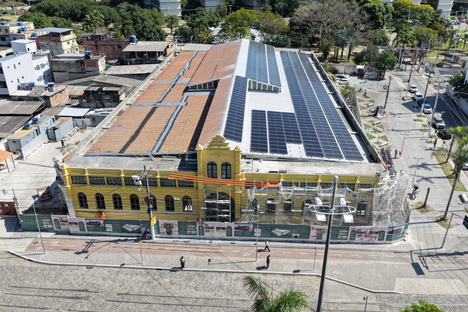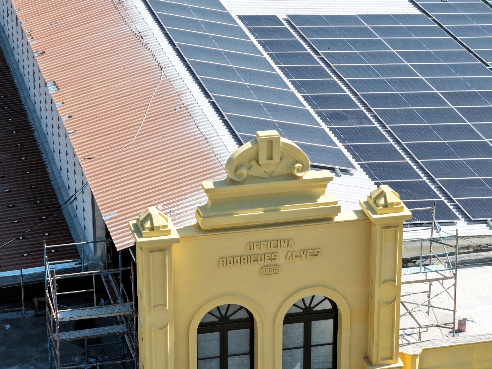 Na cobertura, após a execução do reforço da estrutura metálica existente, a maioria das placas de energia solar já foi instalada.