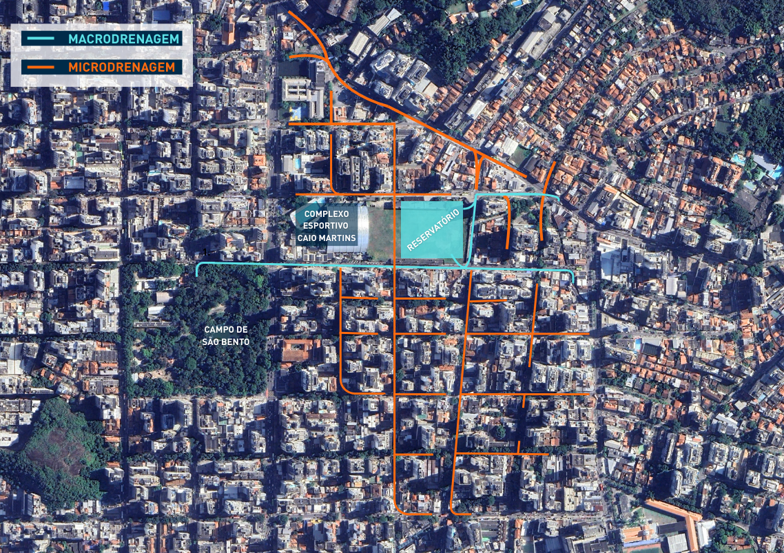 O volume de água coletado será depositado num grande reservatório subterrâneo a ser construído em parte do terreno onde hoje se encontra o campo de futebol do Estádio Caio Martins, com capacidade para 102.659 m³ e área de cerca de 15 mil m², abrangendo, também, a parte onde se localizam as arquibancadas voltadas para a rua Presidente Backer, que serão demolidas.