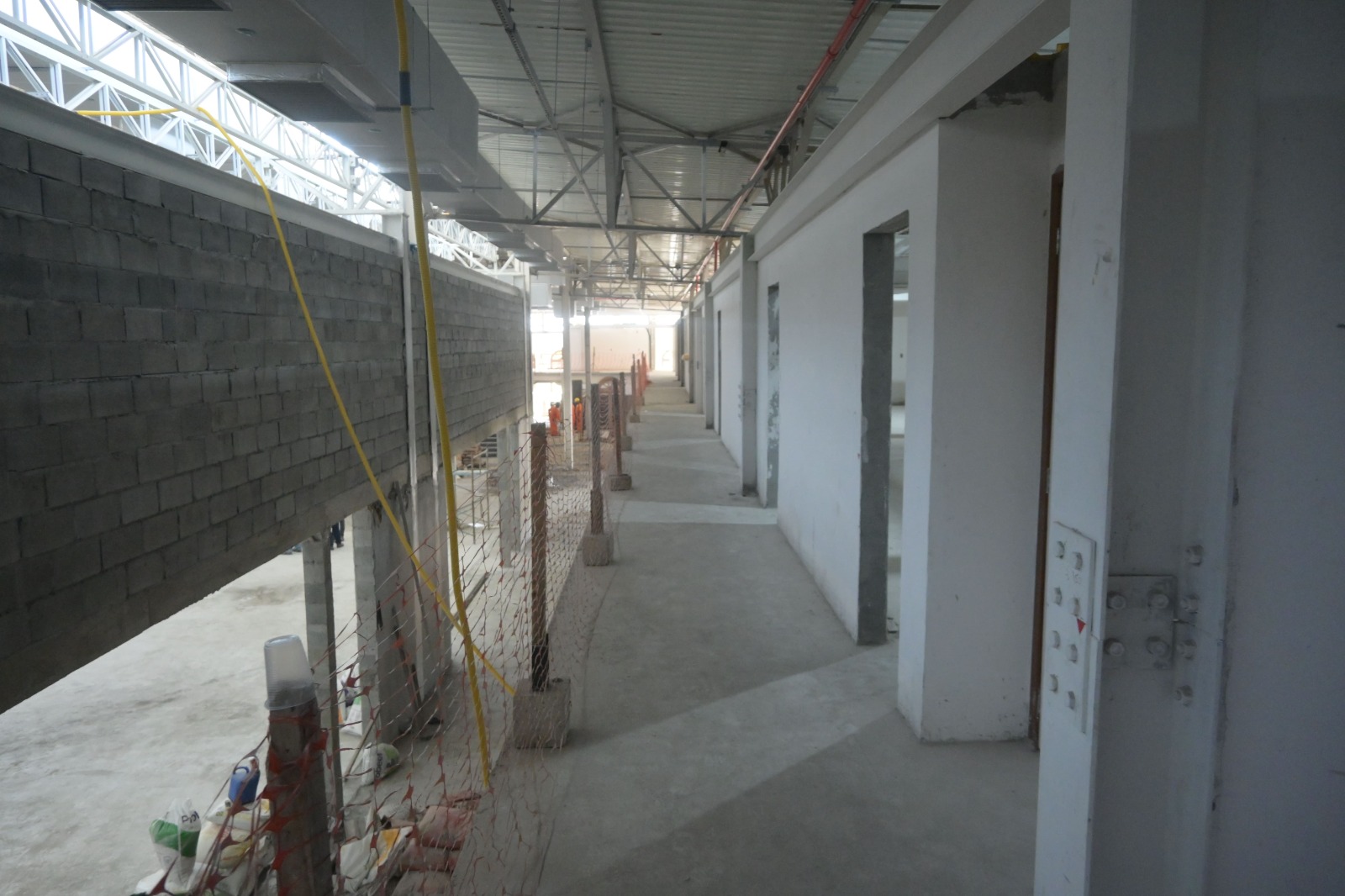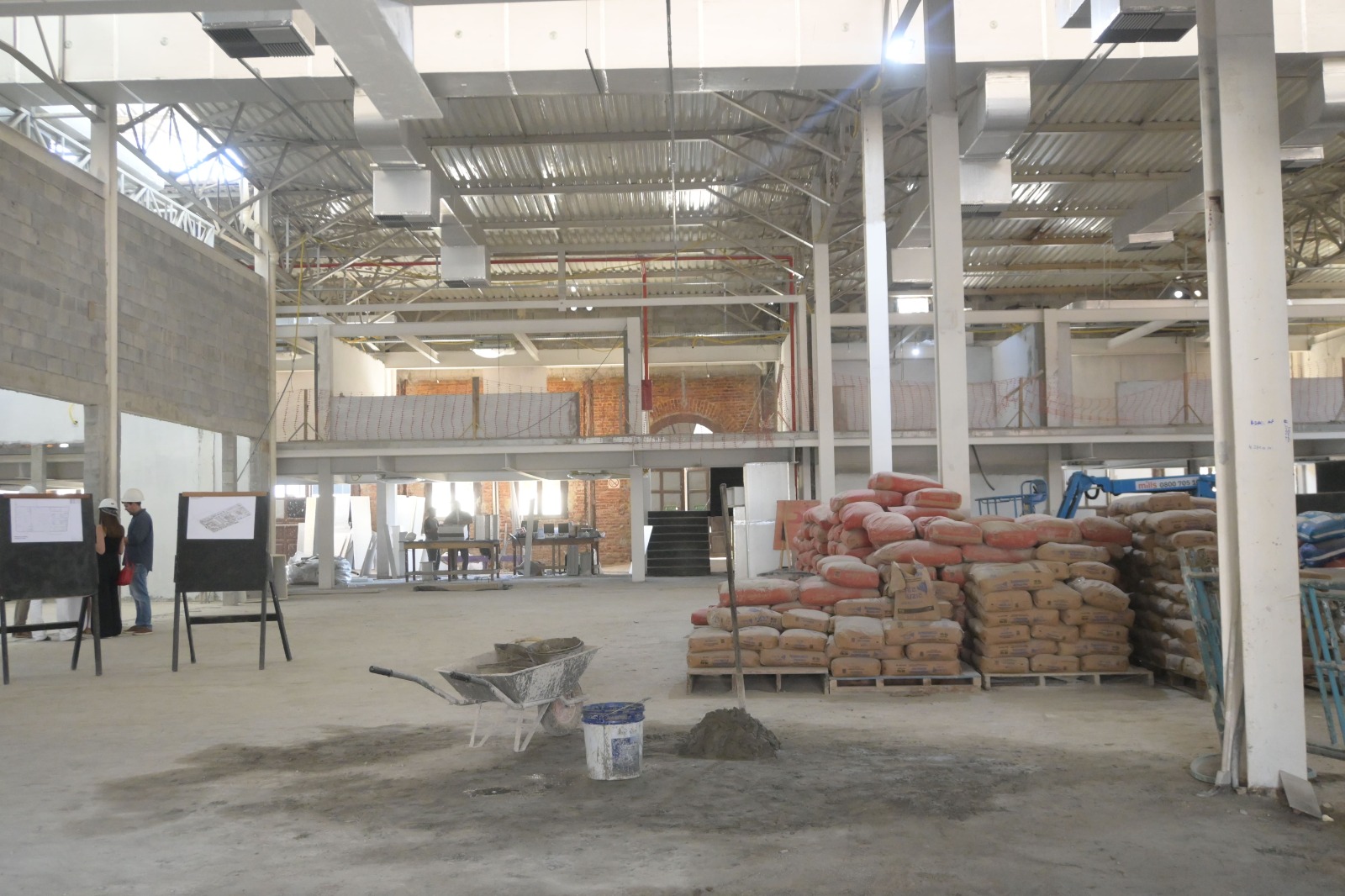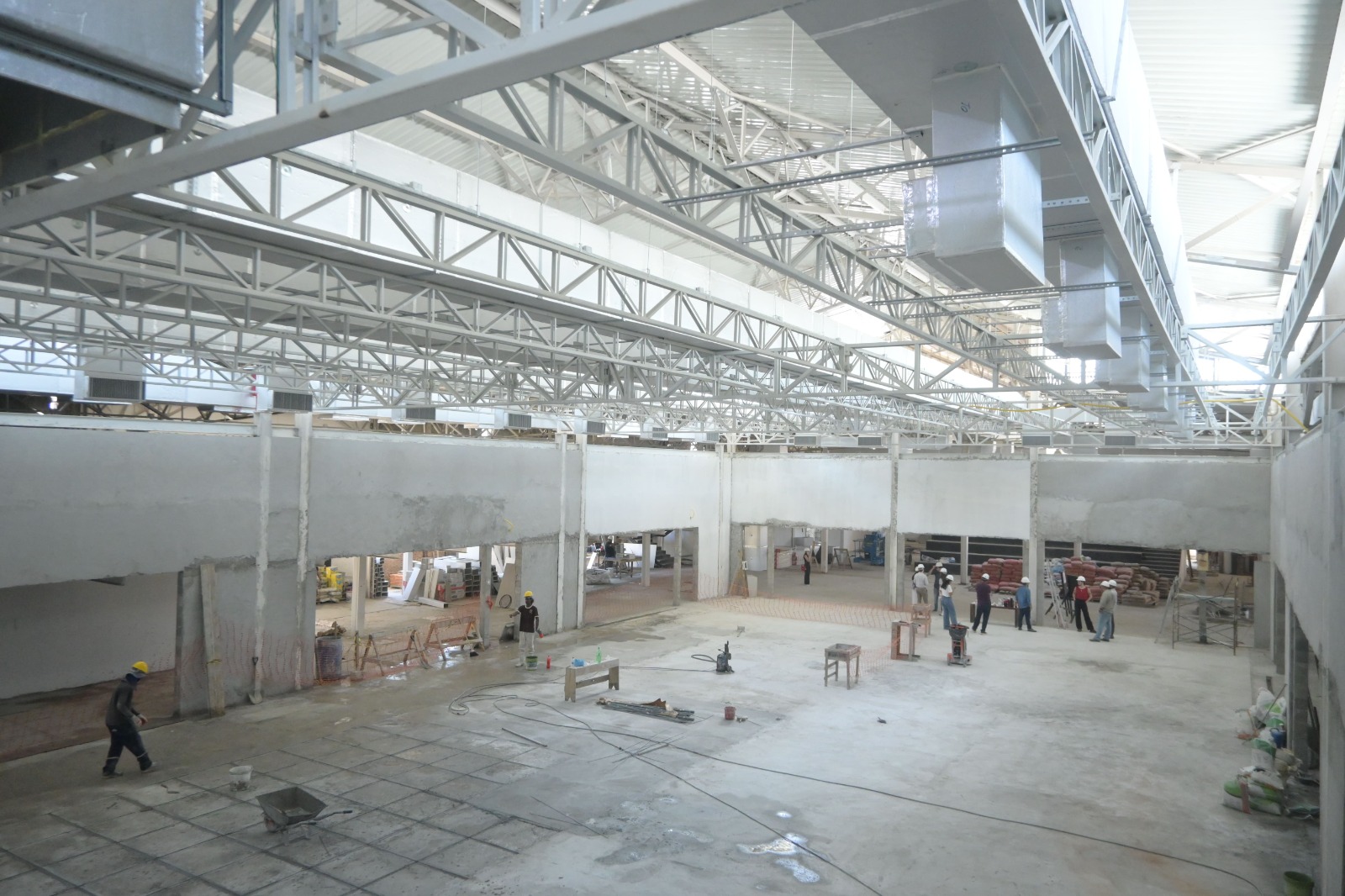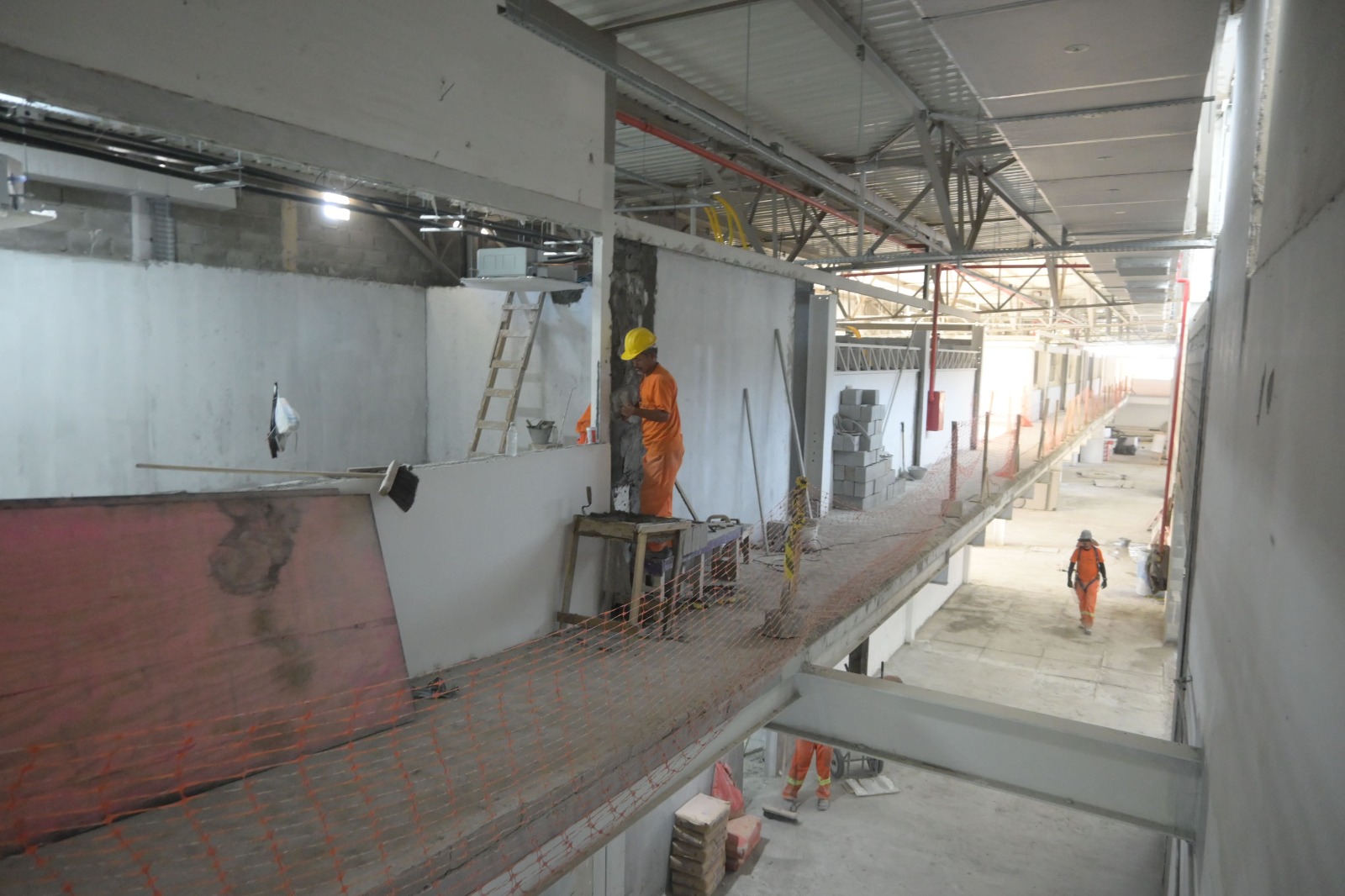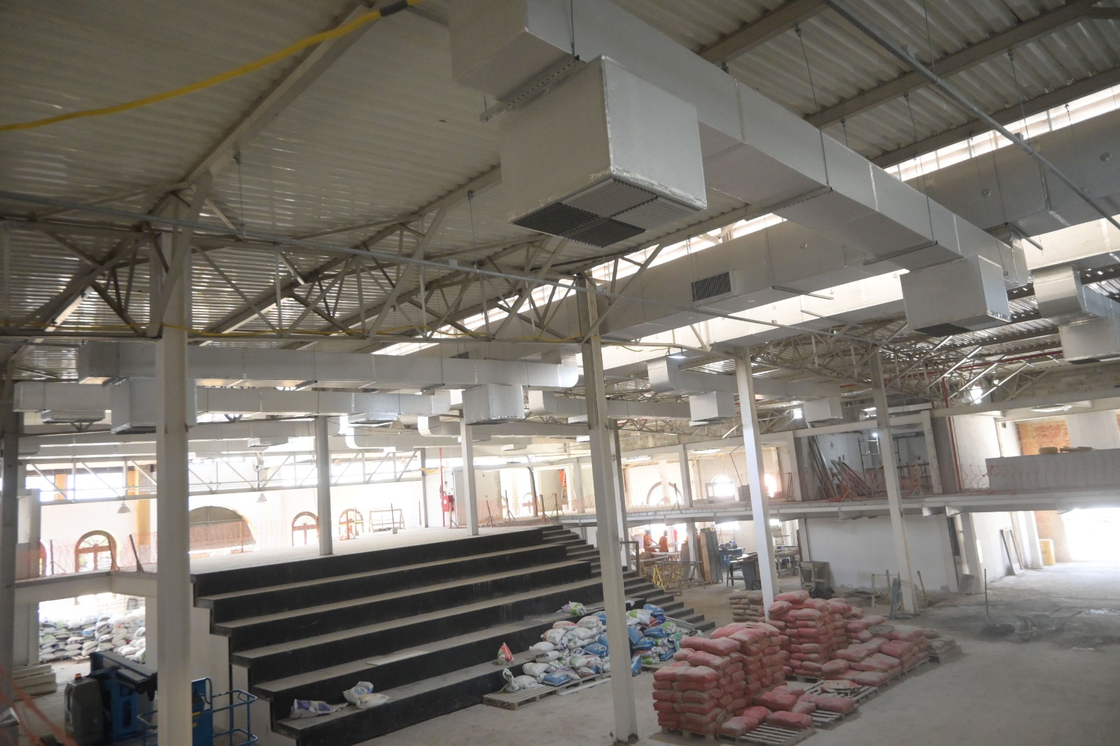 No momento , as equipes trabalham na instalação do piso granilite, instalação do sistemas de ar-condicionado e exaustão, reboco nas salas e auditório.