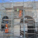 A fachada principal passa por processo de restauração, com serviços de pintura e recuperação avançando gradualmente.