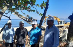 O presidente da Emusa, Paulo César Carrera, e o secretário municipal de Obras, Vicente Temperini, acompanharam o prefeito Axel Grael durante vistoria às obras de estabilização e recuperação do calçadão da Praia de Piratininga, na Região Oceânica.