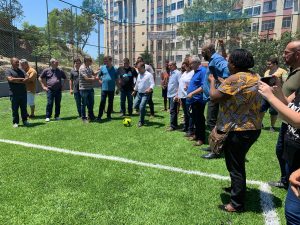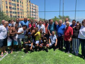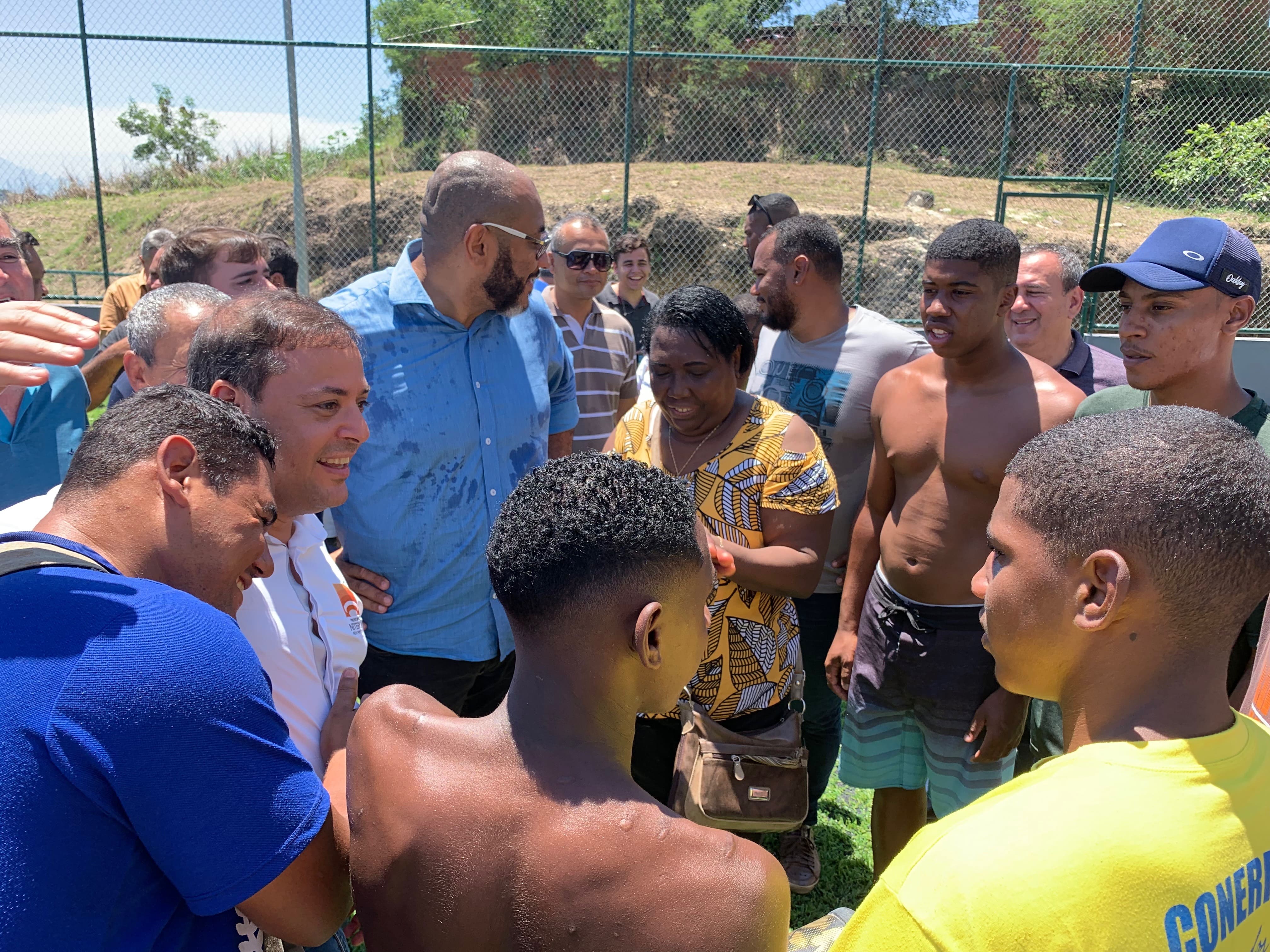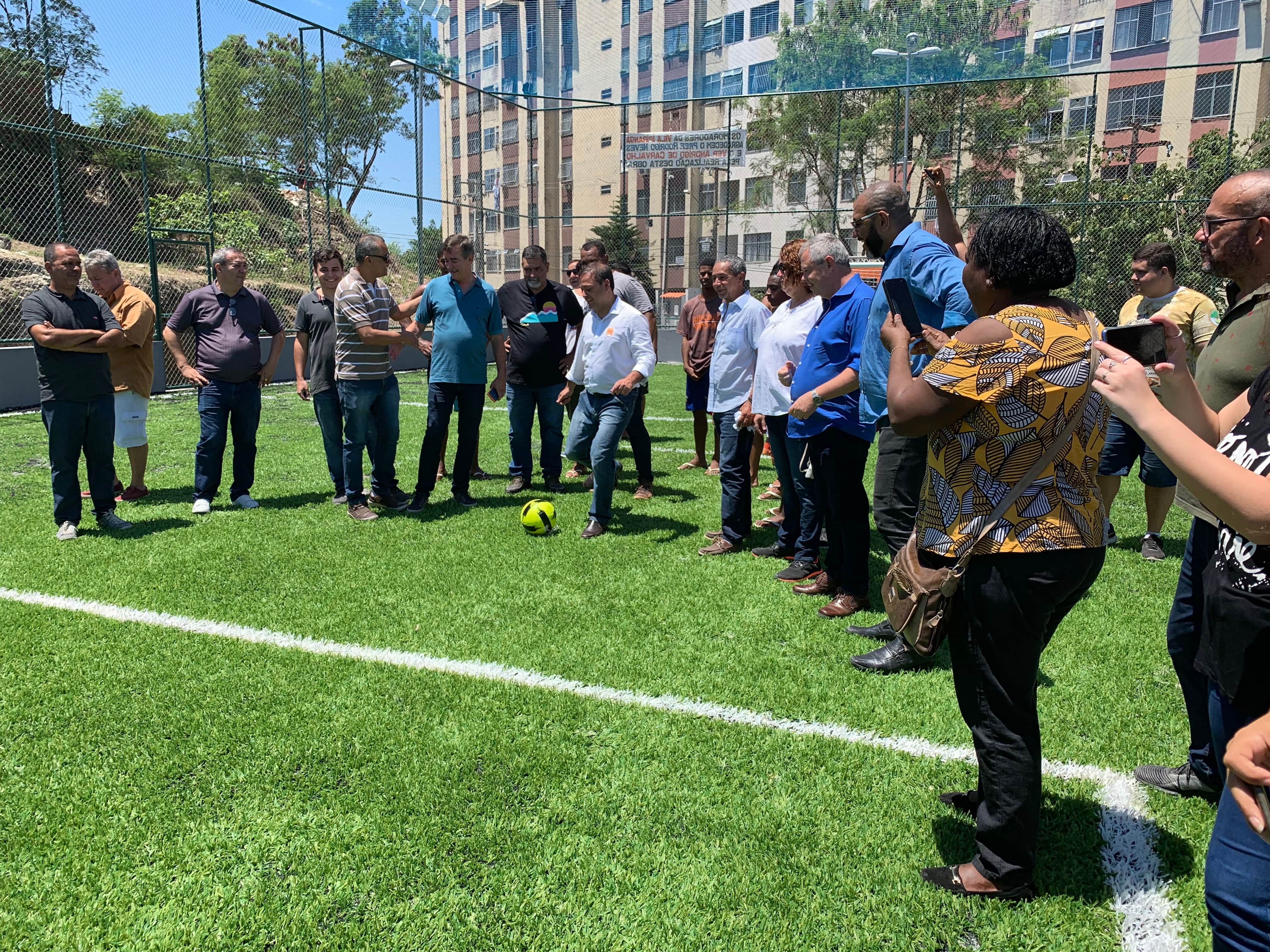 O Fonseca recebeu, neste sábado (12), a visita do prefeito Rodrigo Neves e de representantes da Emusa para a entrega de novos espaços de convivência e prática de esporte e lazer. Na Rua Conrado Barbosa de Souza, na Vila Ipiranga, foram investidos R$490 mil na construção de um campo de futebol com grama sintética, alambrado, tela de proteção de refletores. A área de lazer recebeu um playground com brinquedos infantis, bancos e mesas de concreto, churrasqueira e banheiros. No local, serão organizados futuros campeonatos de futebol com os adolescentes e jovens da região.